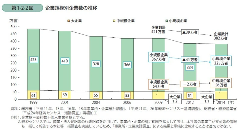 2009年から2014年の企業数では、小規模企業者は約41万者減少しました。中規模は2万者増加、大企業は800者減少しました。