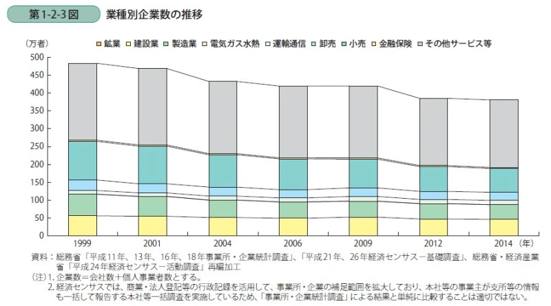 ※対応する図表としては31ページの第1-2-3図「業種別企業数の推移」になりますが、以下に第1-2-3図を示すように見分けが付きにくいです。