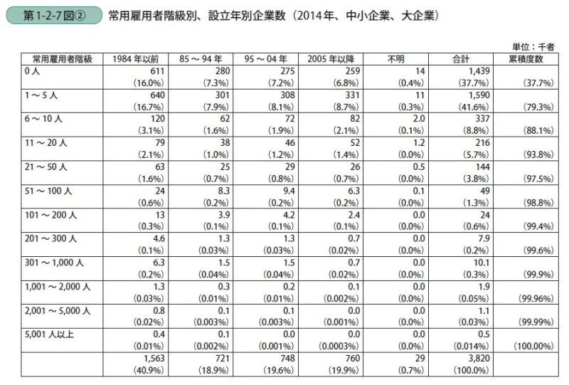 また、総務省「平成21年、26年経済センサス−基礎調査」に基づき、2009年から2014年にかけての企業数の変化を見た場合、企業数は約40万者減少しているが、「1984年以前」の設立企業数が減少する一方で、2005年以降の設立企業数は増加している。