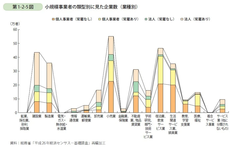 本問は、小規模企業白書2018年版第1部第2章第1節2「小規模事業者の類型別に見た企業数(業種別)」第1-2-5図(29ページ)からの出題となります。