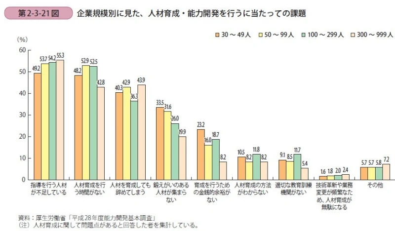 また、「規模が小さくなるほど、鍛えがいのある人材が集まらないといった、教えられる側の人材不足の課題を抱えている企業の割合が高くなって いることが見て取れる。」とも書かれています。