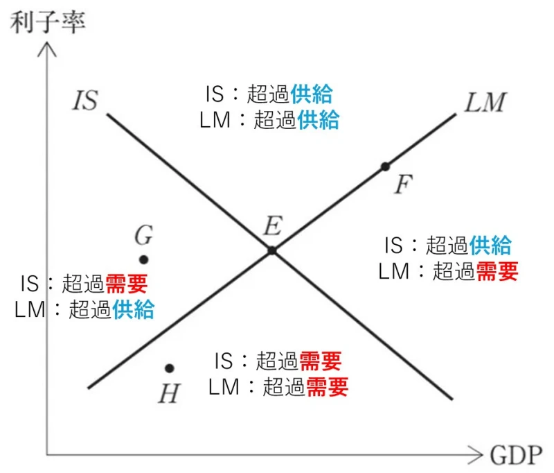 ・LM曲線の左上側が超過「供給」、右下側が超過「需要」