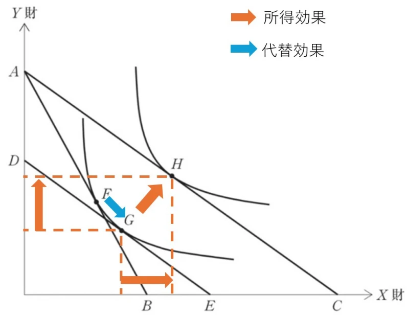 そのため、代替効果の始点は予算制約線DEと接している点Gではなく、予算制約線ABと接している点Fになります。