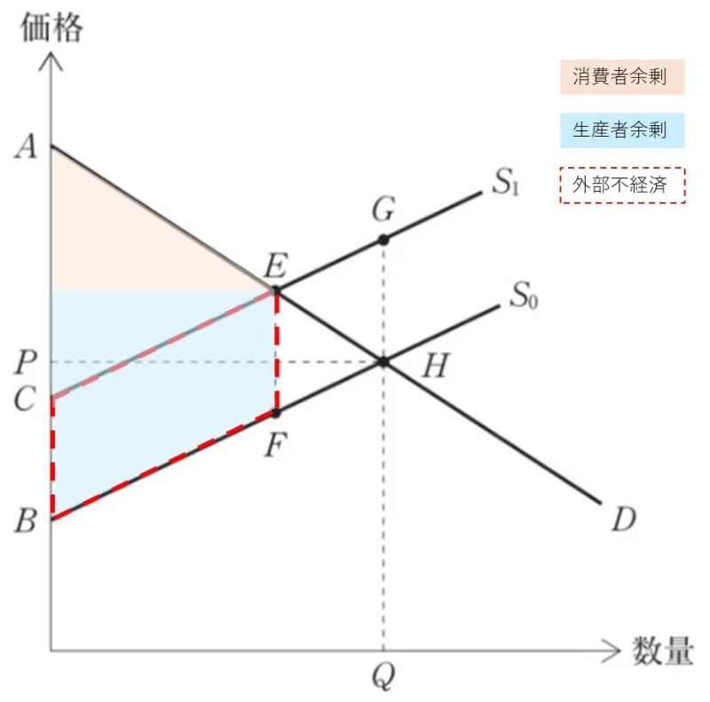 b.市場均衡の下での外部費用は、四角形EFHGである。
