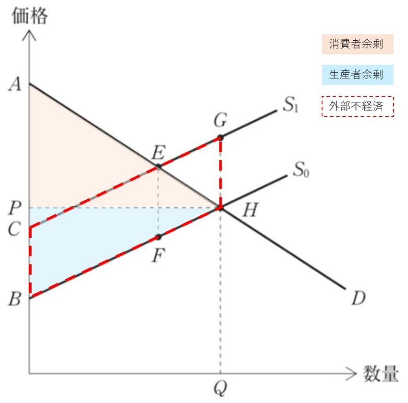 (生産者余剰の一部が外部不経済と重複しているため、外部不経済の範囲を除外→「最適点が達成された」と考えると理解しやすいです)