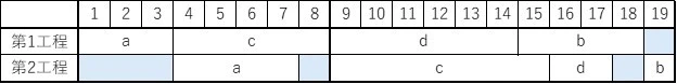 「a:第1工程」「c:第1工程」「d:第2工程」「b:第2工程」の順番に、第1工程と第2工程の作業時間を描いたものが以下の図となります。