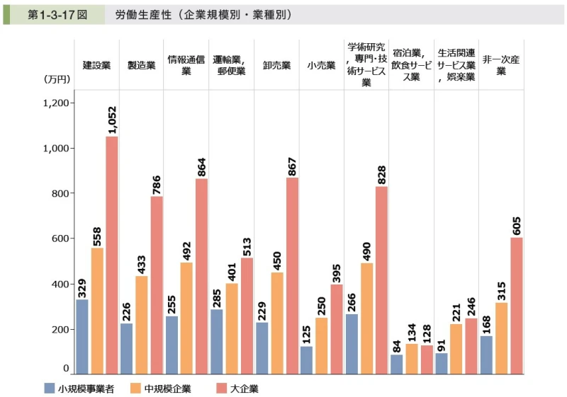 出所は、2024年版中小企業白書Ⅰ-93ページ第1-3-17図「労働生産性(企業規模別・業種別)」となります。